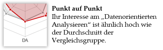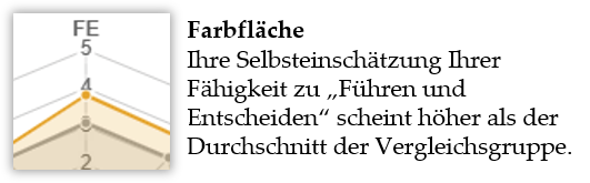 Wenn für einen Faktor eine Ecke Ihres farbigen Diagramms auf der Skala höher liegt als die Ecke des Diagramms der Vergleichsgruppe, dann liegen Ihre Werte höher als der Mittelwert der Vergleichsgruppe. In diesem Fall wird die Differenz als farbige Fläche angezeigt.