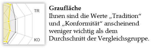Wenn für einen Faktor eine Ecke Ihres farbigen Diagramms auf der Skala niedriger liegt als die Ecke des Diagramms der Vergleichsgruppe, dann liegen Ihre Werte niedriger als der Mittelwert der Vergleichsgruppe. In diesem Fall wird die Differenz als graue Fläche angezeigt.