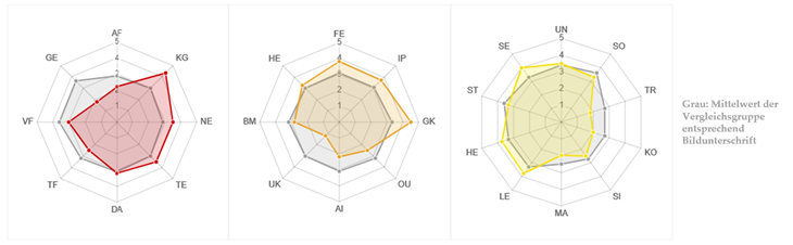 Ihre Angaben sind die Basis für das jeweils farbig (rot, orange, gelb) gestaltete Diagramm. Die Mittelwerte der Vergleichsgruppe sind darunterliegend und grau dargestellt. Die Skala bildet entsprechend der 5-Punkte-Skalierung in der Datenerhebung die eine kontinuierliche Dimension von 1 bis 5 ab.