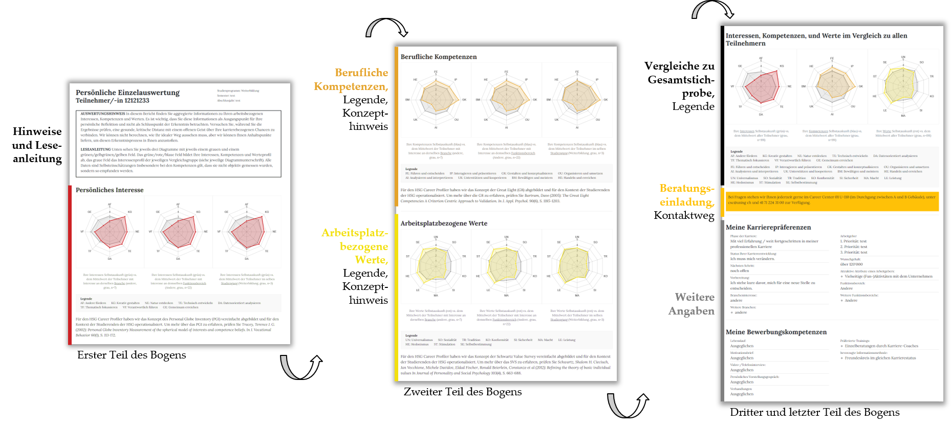 Kernelemente des Auswertungsbogens sind die Spinnennetzdiagramme, in denen Ihre Interessen-, Kompetenzen- und Werteprofile dargestellt und den Gruppenvergleichen gegenübergestellt werden.